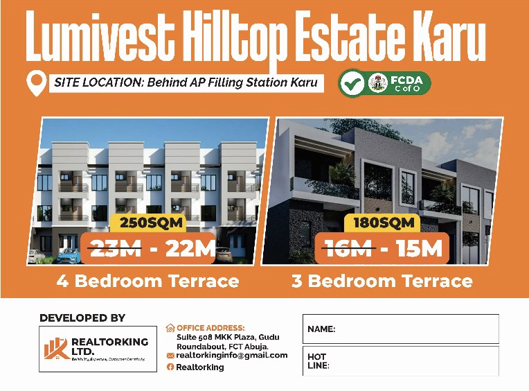 Discover your dream home at Lumivest Hilltop Estate in Karu, Abuja—an exclusive, secure investment with modern, family-friendly homes and stunning views. Limited units available—contact Realtorking Limited today via WhatsApp at 08161876808 or 09017594425 for a free site tour and secure your future in Abuja’s best-kept secret!